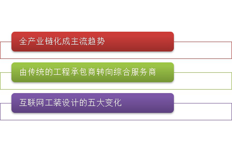 在各种工装业务中,其中办公室装修是非常重要的一项。随着互联网的发展,办公室装修与互联网结合在一起,表现出了三大发展趋势:一是全产业链化成主流趋势,二是传统工程承包商转向综合服务商;三是互联网工装设计的五大变化。